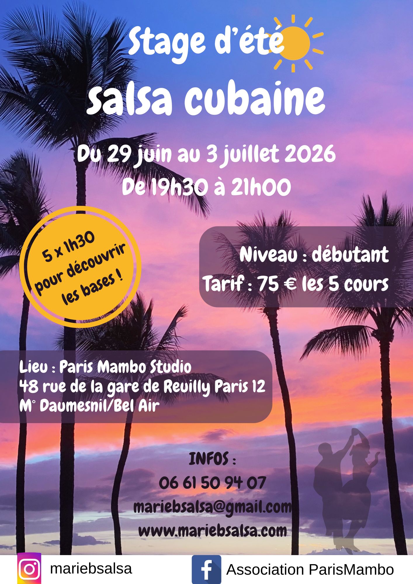 Tous les ans, début juillet, j’organise un stage intensif de salsa cubaine pour les grands débutants sur 5 jours (5 x 1h30).